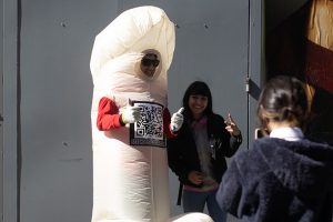 En Concepción, hay una tienda sexshop que tiene una forma atractiva de publicitar: con un corpóreo de pene que baila en la esquina de Barros Arana con Colo Colo. ¿Quién está detrás del disfraz?